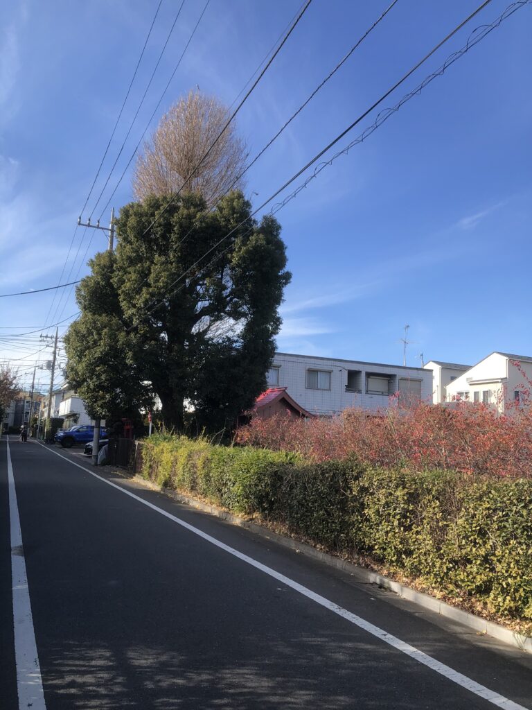 スペース井草 前面道路を少し西に行ったとこの畑と銀杏の木があるお稲荷さんの風景 50年以上ほとんど様子が変わっていない